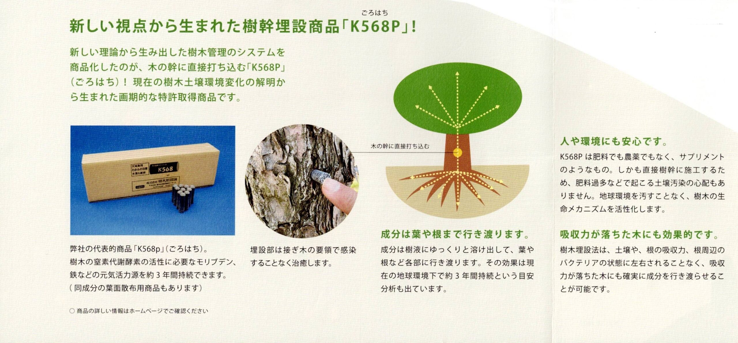 - K568Pは、樹木の窒素代謝を助けて庭木・植物本来の力を強くします。
